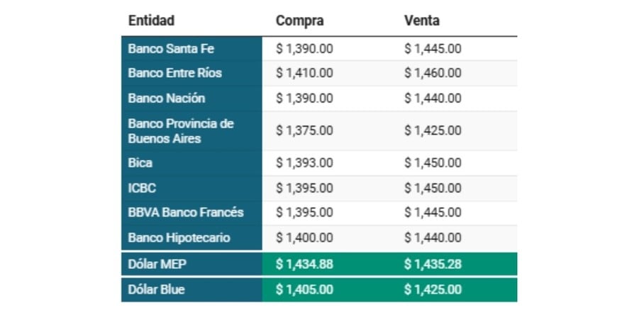 El dólar cerró con movimientos cruzados entre bancos y tipos de cambio paralelos. El blue terminó con subas y el MEP bajó este lunes. El cierre en Banco Nación tuvo a la moneda extranjera en $1390 para la compra, $1440 para la venta.