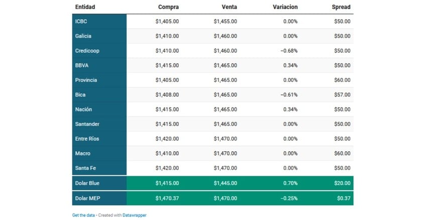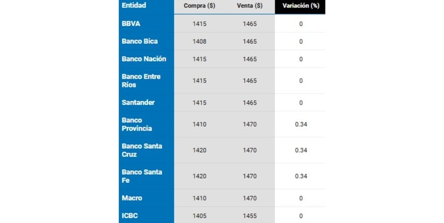 Este miércoles la cotización del dólar oficial se mantuvo sin grandes cambios. El cierre en Banco Nación tuvo a la moneda extranjera en $1415 para la compra, $1465 para la venta.