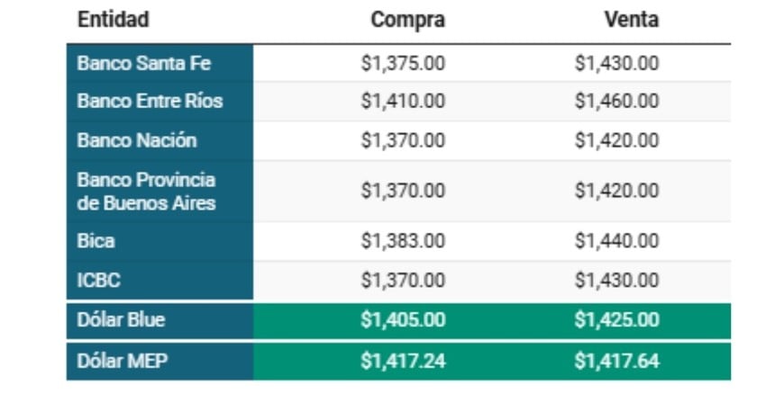 El dólar cerró con bajas en varias pizarras: el blue no tuvo cambios y el MEP, en cambio, bajó. El cierre en Banco Nación tuvo a la moneda extranjera en $1370 para la compra, $1420 para la venta.