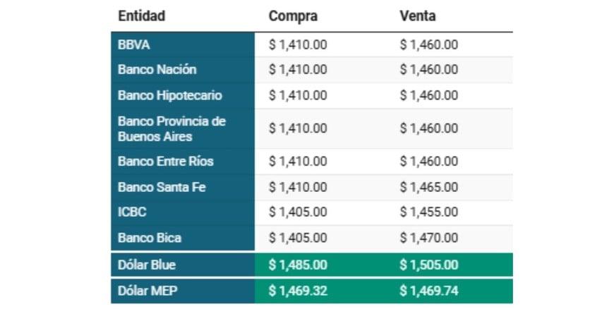 Dólar MEP: Compra: $ 1.471,63 Venta:$ 1.472,46
