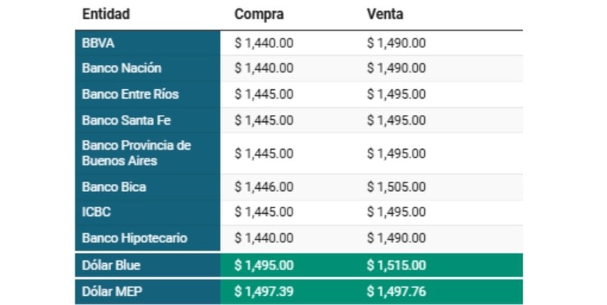 Dólar MEP: Compra: $ 1.496,73 Venta:$ 1.497,24