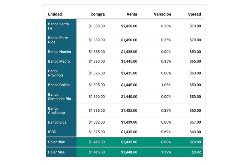 Este miércoles, el dólar blue cerró en $1.415 para la compra y $1.435 para la venta, registrando una leve baja del 0,35 %. Por su parte, el dólar oficial en el Banco Nación finalizó a $1.385 para la compra y $1.435 para la venta.