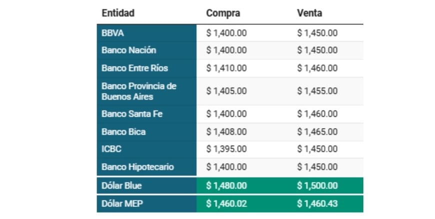 Dólar MEP: Compra: $ 1.461,43 Venta:$ 1.462,18