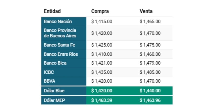 Dólar MEP: Compra: $ 1.463,94 Venta:$ 1.464,35