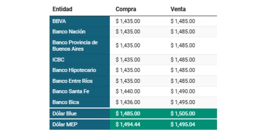 Dólar MEP: Compra: $ 1.493,77 Venta:$ 1.495,13