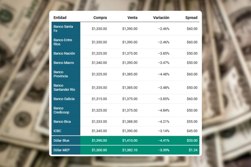El lunes cerró con caídas generalizadas en el dólar oficial, situación similar a lo que ocurrió con el Blue. En el Nación bajó a $1.430 para la venta y $1.380 para la compra, cifras en las que abre este martes 23 de septiembre.