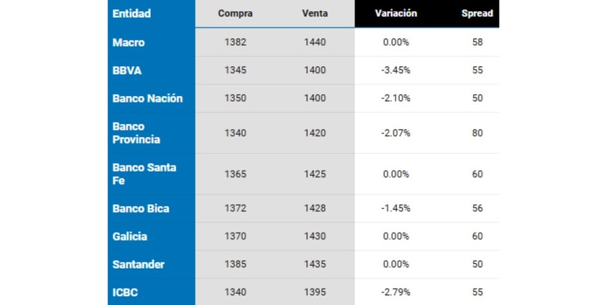 Banco Nación informó que la cotización pasadas las 10.30 era: $1.350 para la compra; $1.400 para la venta.
