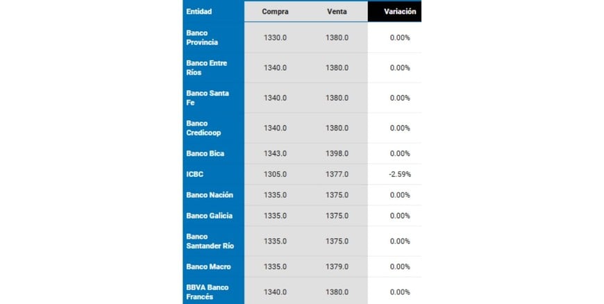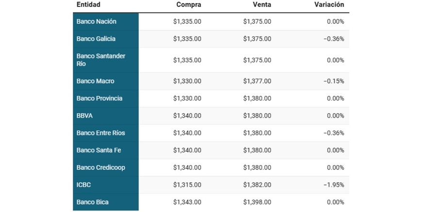 Jueves 04.0912:19 La cotización del dólar en cada banco