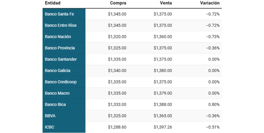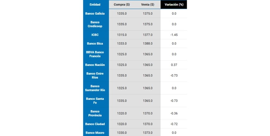 El miércoles cerró con descensos generalizados en el valor del dólar oficial en todos los bancos, mientras que en el Blue retrocedió $5. En el Nación subió a $1.360 para la venta y $1.320 para la compra, cifras en las que abre este jueves 28 de agosto.