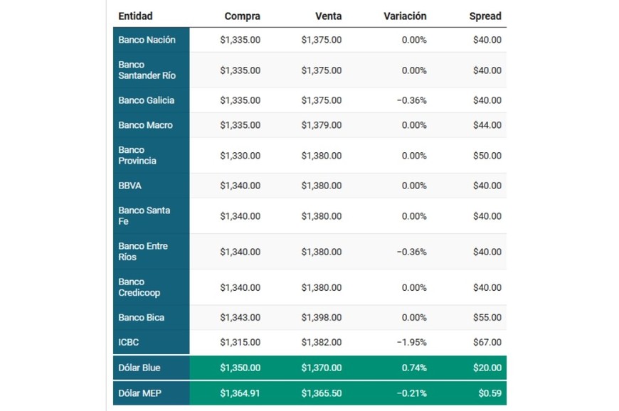 El Banco Bica fue de los pocos en mostrar alzas: cerró en $1.343 para la compra y $1.398 para la venta, con un incremento del 1,08%. Distinto fue el caso del ICBC, que registró la mayor caída porcentual del día: perdió 1,78% y terminó en $1.288,60 para la compra y $1.409,50 para la venta, con un spread de $120,90.