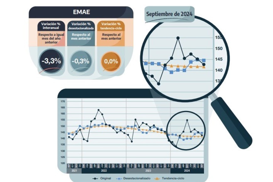 El estimador mensual de actividad económica (EMAE) que elabora el Indec, registró una caída de 3,3% en la comparación interanual (ia) y de -0,3% respecto a agosto en la medición desestacionalizada (s.e.), dato que rompió con dos mediciones positivas inmediatas anteriores: 2,7% en julio y 0,9% en agosto.
