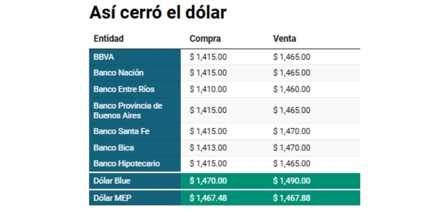 El dólar cerró con una rueda de movimientos dispares en las pizarras bancarias, mientras el blue se mantuvo estable y el MEP terminó con una suba. En el relevamiento del cierre se observaron spreads altos en algunas entidades y diferencias entre bancos, con varias cotizaciones alineadas y otras por encima. El cierre en Banco Nación tuvo a la moneda extranjera en $1415 para la compra, $1465 para la venta.