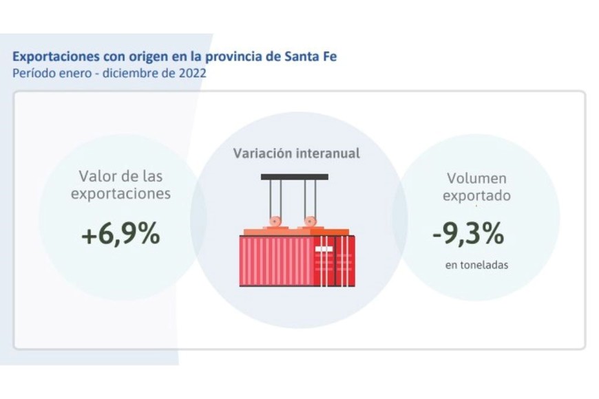 El Instituto Provincial de Estadística y Censos reveló que en el período enero-diciembre de 2022 las ventas al exterior de producción santafesina se incrementó 6,9% medida por su valor, pero retrocedió 9,3% en el volumen de las toneladas despachadas.