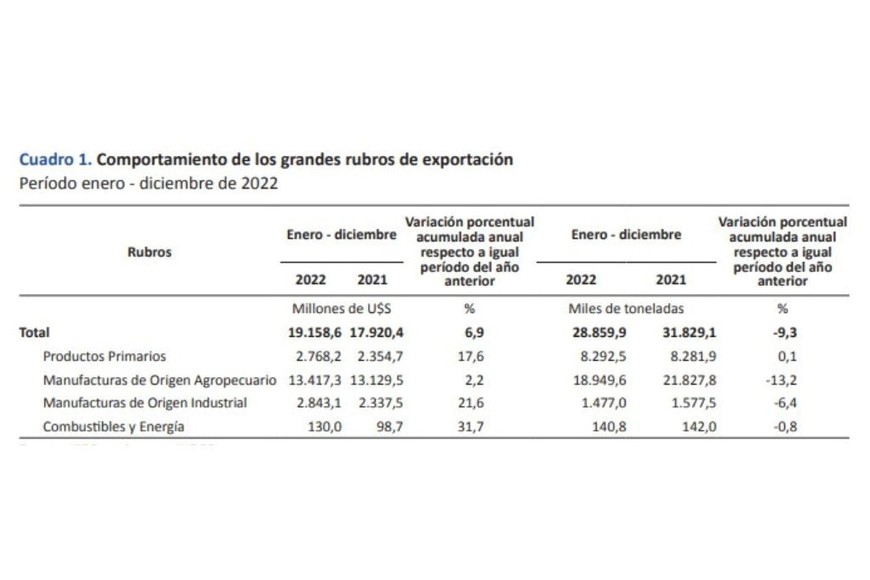 Las proporciones reflejan que se facturaron US$19.158,6 millones en 2022 contra US$17.920,4 millones en 2021. Siempre en la comparación de enero-diciembre de ambos años, los volúmenes representaron 28.859,9 millones de toneladas el año pasado y 31.829,1 millones de toneladas en 2021.