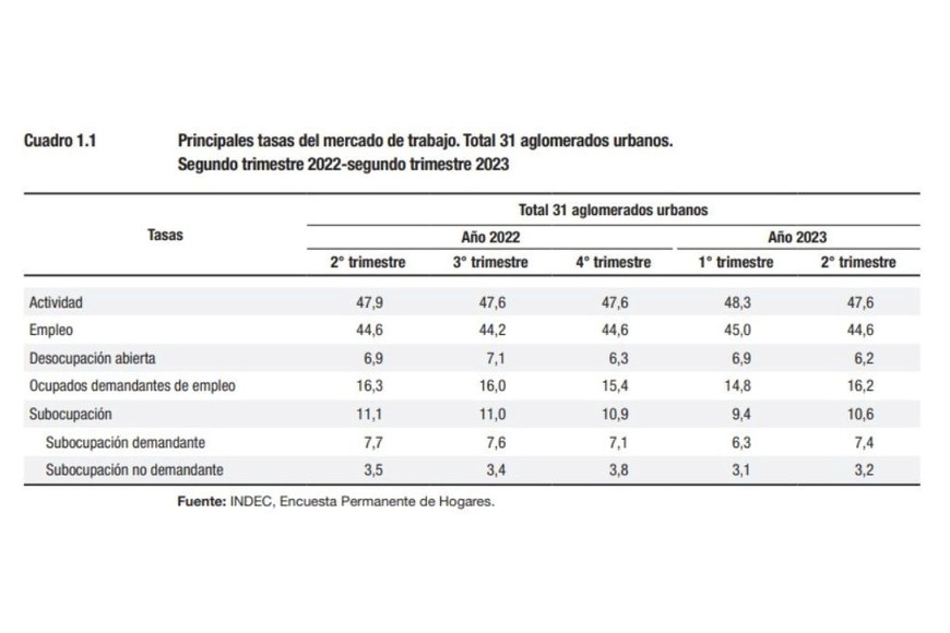 La tasa de subocupación resultó del 10,6% de la PEA, mientras que los otros ocupados demandantes y los otros ocupados no demandantes disponibles alcanzaron, en conjunto, el 11,0% de la PEA. En números absolutos el informe señala 13,1 millones de ocupados y 900 mil desocupados en 31 aglomerados urbanos.