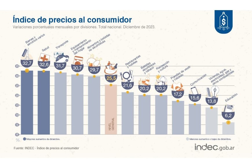 En diciembre, la división de mayor aumento fue Bienes y servicios varios (32,7%), producto de las subas en artículos de cuidado personal; seguida por Salud (32,6%), por las variaciones en medicamentos y las cuotas de medicina prepaga; y Transporte (31,7%), por los incrementos en los combustibles.