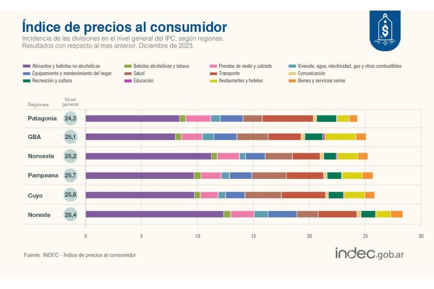 Sin embargo, la división con mayor incidencia en todas las regiones fue Alimentos y bebidas no alcohólicas, con un incremento del 29,7%, precisó el Indec, impulsada por los precios de la Carne y derivados, y de Pan y cereales.