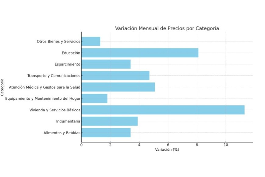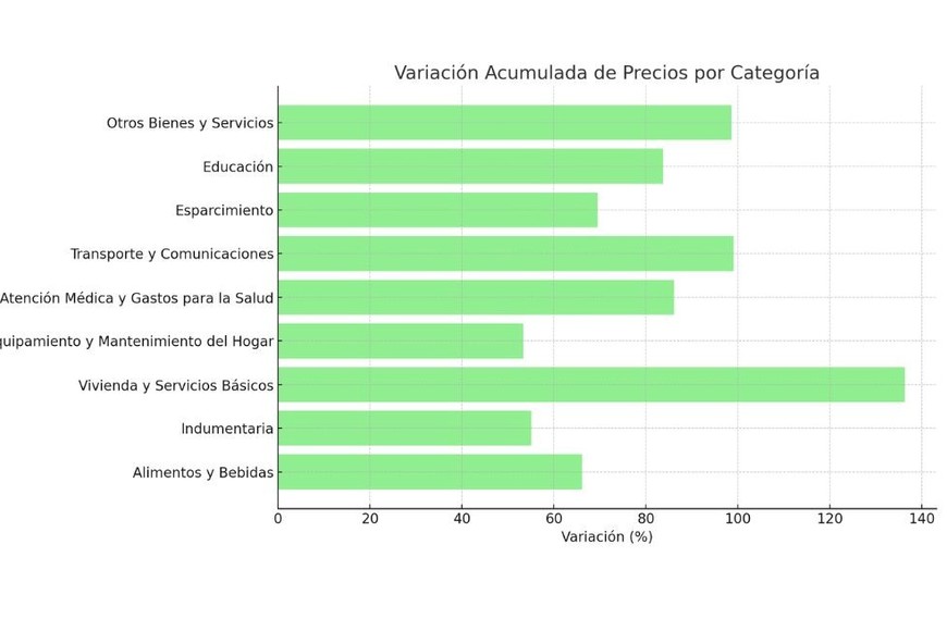 Vivienda y Servicios Básicos: Esta categoría registró el aumento más significativo con un 11,3% en comparación con el mes anterior. La variación acumulada desde diciembre de 2023 es del 136,3%, y en términos interanuales, el aumento es del 257,4%.