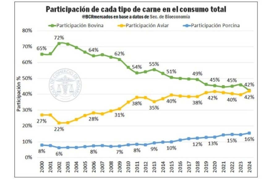 De acuerdo al informe de la Bolsa de Comercio de Rosario, para un consumo estimado de 106 kilos de carne por habitante en la Argentina 2024, "la composición de la dieta cárnica del habitante promedio sería la siguiente: 42% de carne bovina, 42% de carne aviar y 16% de carne porcina. La proporción de carne bovina habría caído 3,5 puntos porcentuales respecto al 2023. Al mismo tiempo, el consumo de carne aviar aumentó 2,4 puntos porcentuales de forma interanual. Por primera vez en los registros, el habitante promedio en Argentina consumiría en 2024 la misma cantidad de carne vacuna que de carne aviar (alrededor de 44,5 kg.). El consumo de carne porcina, por su parte, aumentaría 1,1 puntos porcentuales respecto al año previo".