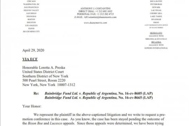 El fondo Bainbridge Capital pidió a la jueza Loretta Preska aplicar nuevamente las medidas cautelares que el fallecido juez Thomas Griesa dictó contra la Argentina en 2014.