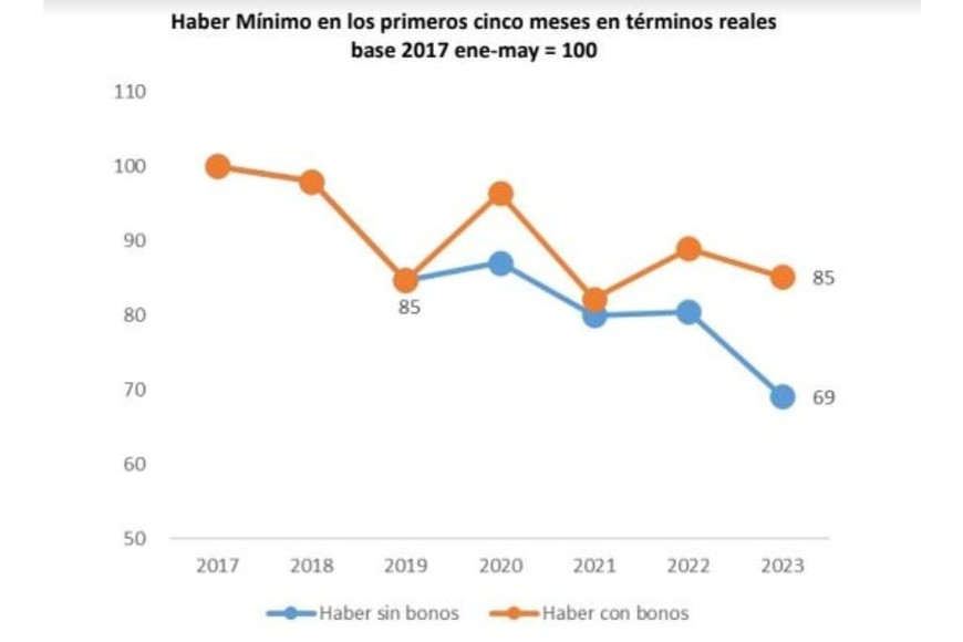 “Cobrando bonos, el poder adquisitivo de los primeros cinco meses del año de los jubilados argentinos con la mínima, habría caído un 4,5% respecto a igual periodo de 2022. Sin cobrar bonos, la caída habría sido del 14%”, reporta el referente del Instituto Argentino de Análisis Fiscal.