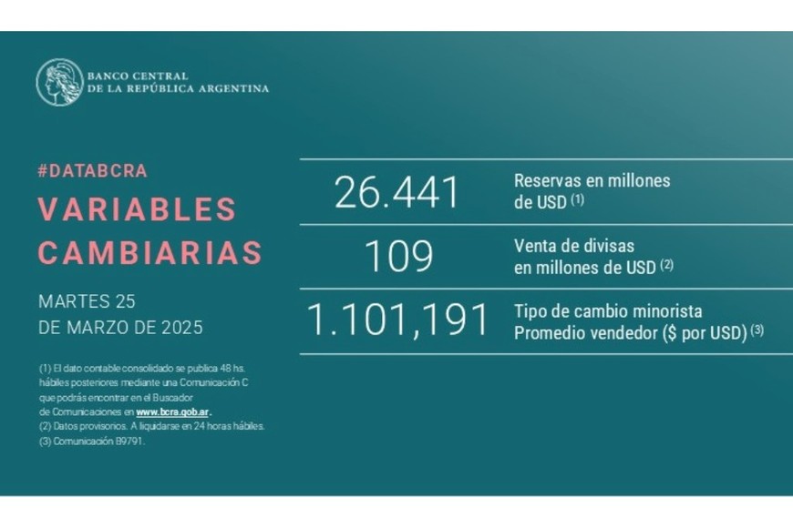 En ese marco, las reservas brutas internacionales sufrieron un retroceso de u$s185 millones para ubicarse en los u$s26.441 millones, nuevo mínimo desde el 30 de septiembre de 2024.