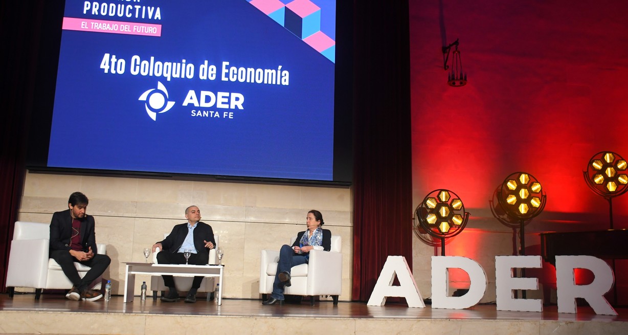 Marina Dal Poggetto y Emmanuel Álvarez Agis disertaron en el Cuarto Coloquio de Economía organizado por la Asociación para el Desarrollo Regional que preside Nicolás Cabó, que se desarrolló en el Paraninfo de la UNL. Foto: Manuel Fabatía.