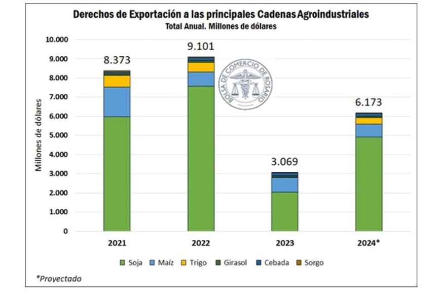 Entre enero y junio de este año el agro aportó US$ 2.660 millones por derechos de exportación a las arcas del Tesoro. La cifra, calculada por la Bolsa de Comercio de Rosario, "más que duplica el aporte de los primeros seis meses del 2023, con un estimado de US$ 1.153 millones en ese período". Sin embargo está al mismo tiempo muy por debajo de los US$4.608 millones de la primera mitad de 2022 o de los US$4.529 millones del primer semestre del 2021.