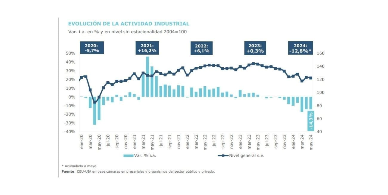 En mayo la actividad industrial registró una caída interanual del 14,3% y del 0,6% respecto de abril, a nivel nacional, según el último reporte del Centro de Estudios de la Unión Industrial Argentina. El marcador está en línea con el retroceso sectorial santafesino del 11% informado por la FISFE y llega tras la revelación del Indec, según la cual la utilización de la capacidad fabril instalada sólo alcanza el 56,8% en el país.