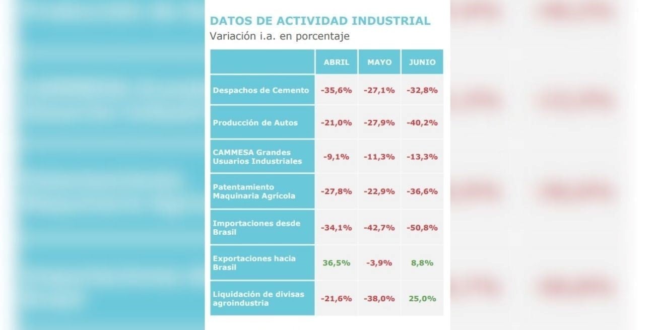 En mayo “se observaron bajas pronunciadas en el sector Automotor (- 40,2% i.a.), despachos de Cemento (- 32,8% i.a.), y Patentamientos de maquinaria agrícola (-36,6% i.a.). Por otro lado, la Demanda de energía eléctrica de Grandes Usuarios Industriales también continuó cayendo (- 13,3% interanual) y, en cuanto al intercambio comercial con Brasil, las importaciones disminuyeron (-50,8% i.a.), mientras que las exportaciones aumentaron (+8,8% i.a.)”.