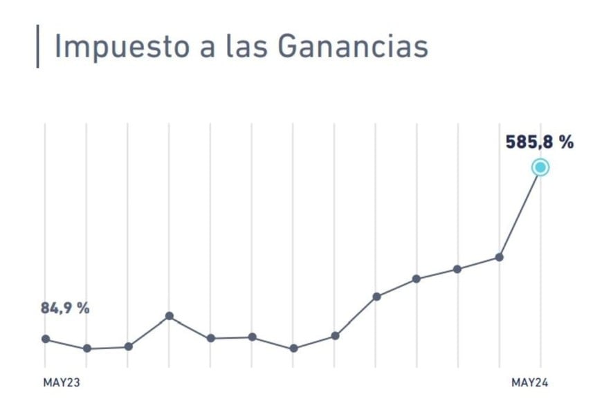 En la suba real, en medio de la recesión económica, el Impuesto a las Ganancias presentó una variación interanual positiva de 585,8%, recaudando $ 5.511.952 millones. Según el informe oficial de la Afip, el resultado está vinculado al vencimiento del saldo de Declaración Jurada del período fiscal 2023 de las Sociedades con cierre diciembre, que es el más importante del año, y se caracterizó por el "buen desempeño de la Actividad Financiera".