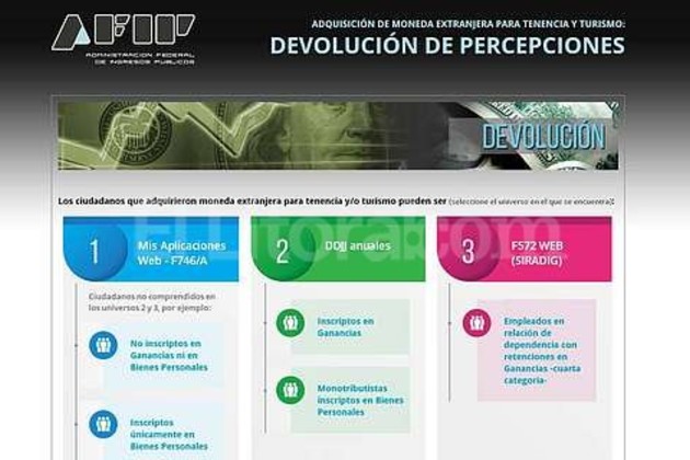 La Administración Federal de Ingresos Públicos (AFIP) habilitó la página web http://www.afip.gob.ar/genericos/devolucionpercepcion/ para ingresar los pedidos de devolución de las percepciones por operaciones en moneda extranjera durante los períodos 2012, 2013 y 2014 aún no presentados.