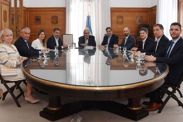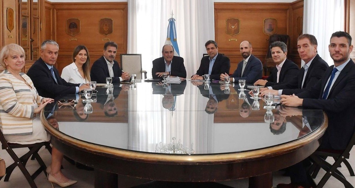 Diego Santilli, Silvia Lospennato, José Nuñez, Luciano Laspina, Silvana Giudici y Damián Arabia, visitaron al titular de la cartera y a su segundo, Lisandro Catalán, en el Salón de los Escudos para avanzar en la sanción de la ley que obsesiona a la administración libertaria. También estuvieron el asesor presidencial, Santiago Caputo, y el vicejefe de Gabinete, José Rolandi.