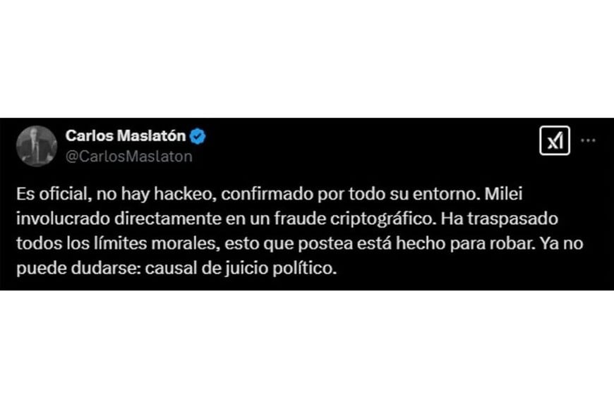 La publicación fue repudiada por el economista liberal Carlos Maslatón, quien denunció: “Es oficial, no hay hackeo, confirmado por todo su entorno. Milei involucrado directamente en un fraude criptográfico. Ha traspasado todos los límites morales; esto que postea está hecho para robar. Ya no puede dudarse: causal de juicio político”.