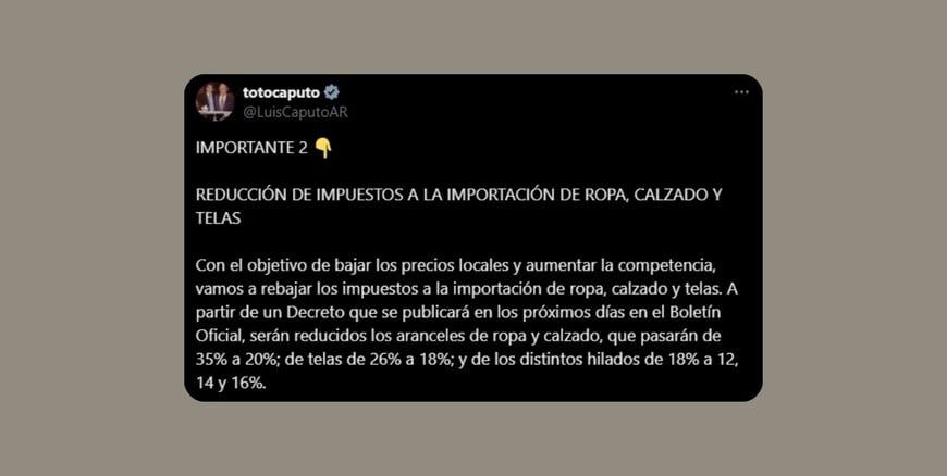 “Con el objetivo de bajar los precios locales y aumentar la competencia, vamos a rebajar los impuestos a la importación de ropa, calzado y telas. A partir de un Decreto que se publicará en los próximos días en el Boletín Oficial, serán reducidos los aranceles de ropa y calzado, que pasarán de 35% a 20%; de telas de 26% a 18%; y de los distintos hilados de 18% a 12, 14 y 16%”, indicó Caputo a mediados de mes.