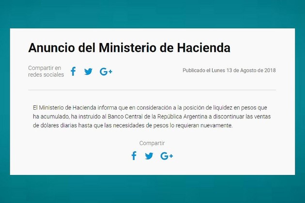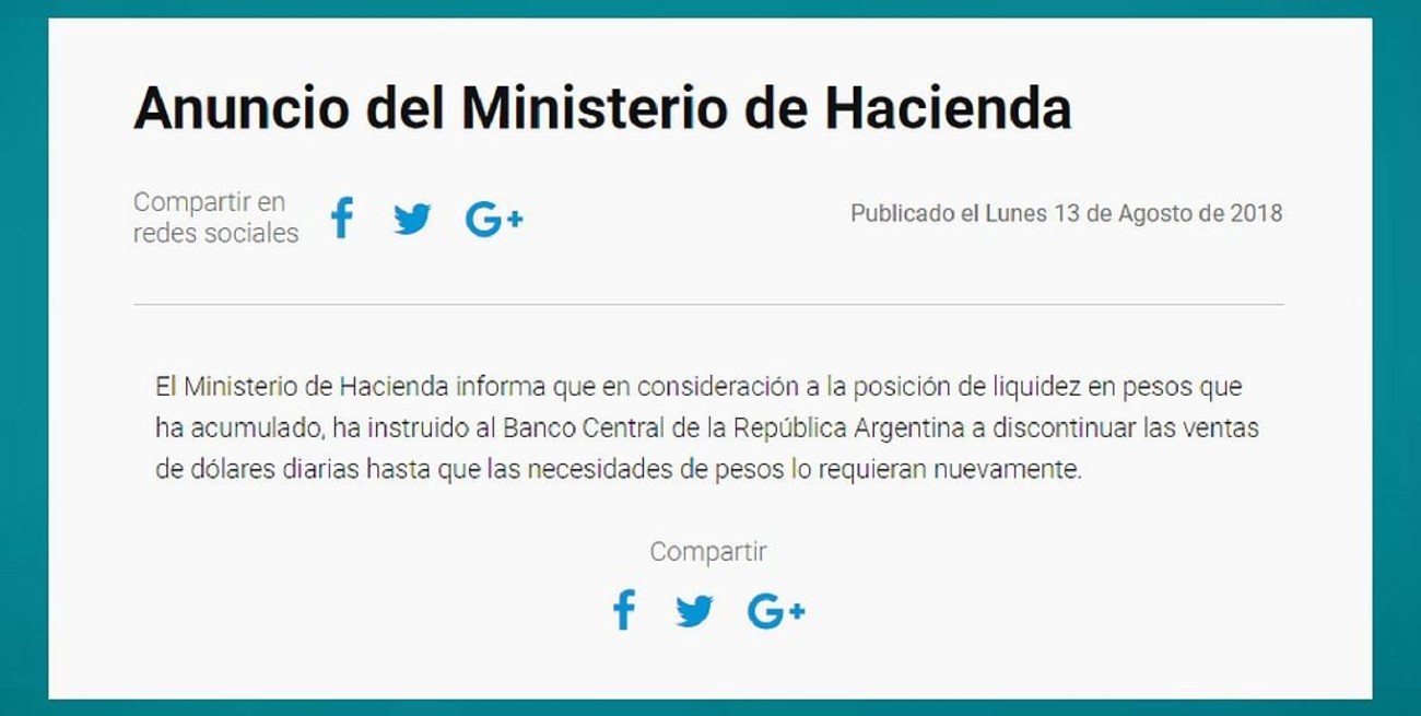 Todo este revuelo llevó al Ministerio de Hacienda a publicar otro comunicado aclarando la situación: que no volvió el cepo cambiario: "La decisión anunciada hoy de instruir al Banco Central de la República Argentina a suspender las ventas de 50 millones de dólares diarios, se refiere exclusivamente a las ventas de dólares asociadas al componente de apoyo presupuestario del financiamiento provisto por el Fondo Monetario Internacional que el Banco Central venía llevando a cabo por cuenta y orden del Ministerio de Hacienda".