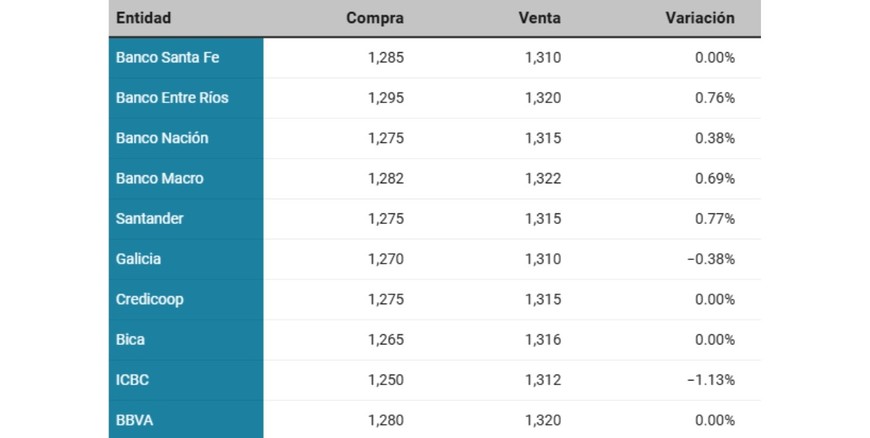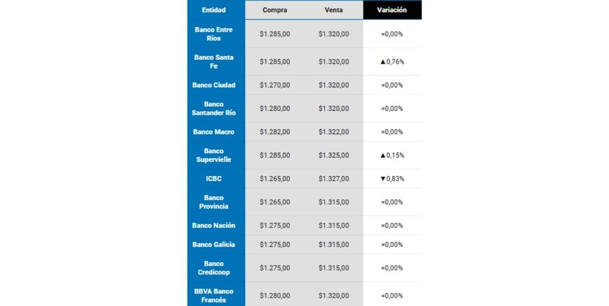 El dólar “blue” se ofrecerá a $ 1.320 y $ 1.340 para ambas puntas. En tanto, el MEP lo hará en $ 1.309 y el Contado con Liquidación en $ 1.311.