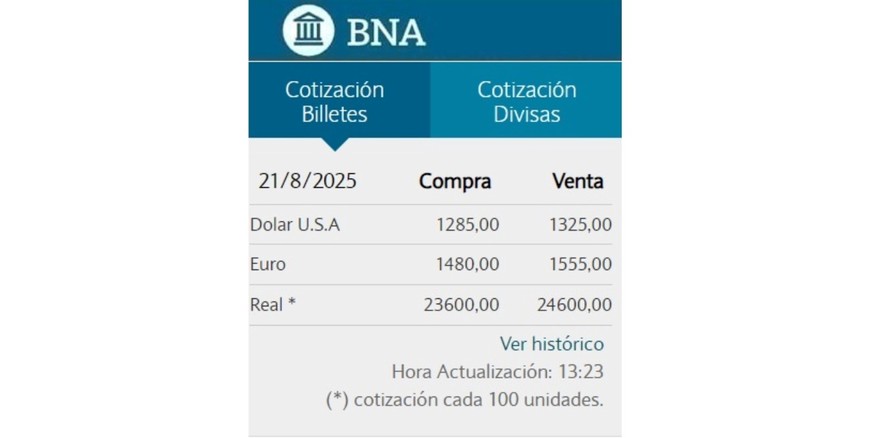 El miércoles cerró con sostenimientos en el valor del dólar oficial en la mayoría de los bancos, al igual que en el Blue. En el Nación se sostuvo a $1.315 para la venta y $1.275 para la compra, cifras en las que abre este jueves 21 de agosto.