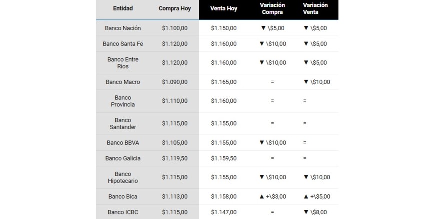 En Banco Macro el dólar cerró a $ 1.090,00 para la compra y $ 1.175,00 para la venta. Mientras que en Banco Provincia (Buenos Aires) cerró a $1.160 para la venta y $ 1.110 para la compra. En Banco Santa Fe el precio de compra de este viernes fue $ 1.120,00 y de venta $ 1.155,00. En tanto, Banco Bica tuvo los siguientes precios: $ 1.163,00 para la venta, $ 1.118,00 para la compra.