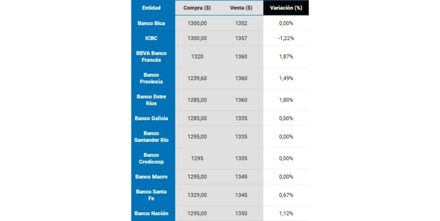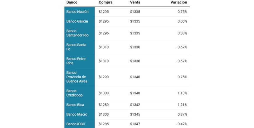 El viernes cerró con leves aumentos en el valor del dólar oficial en la mayoría de los bancos, al igual que en el Blue. En el Nación se sostuvo a $1.335 para la venta y $1.295 para la compra, cifras en las que abre este lunes 25 de agosto.