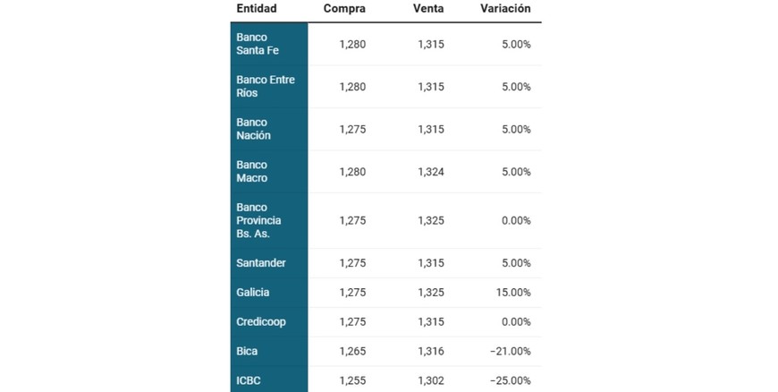El lunes cerró con estabilización en el valor del dólar oficial en la mayoría de los bancos y en el Blue. En el Nación si subió a $1.315 para la venta y $1.275 para la compra, cifras en las que abre este martes 19 de agosto.