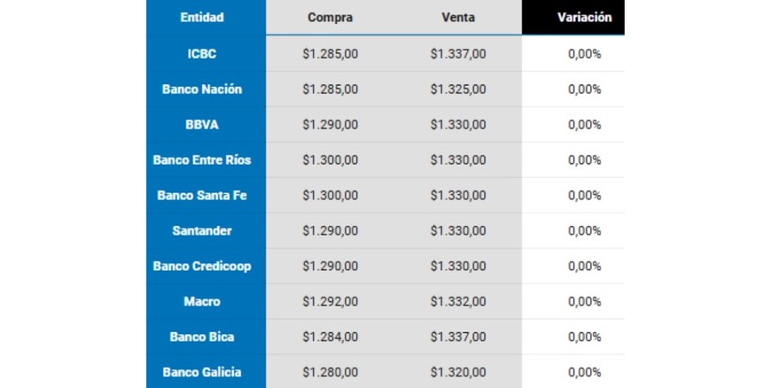 El dólar “blue” se ofrecerá a $ 1.315 y $ 1.335 para ambas puntas. En tanto, el MEP lo hará en $ 1.303 y el Contado con Liquidación en $ 1.302.