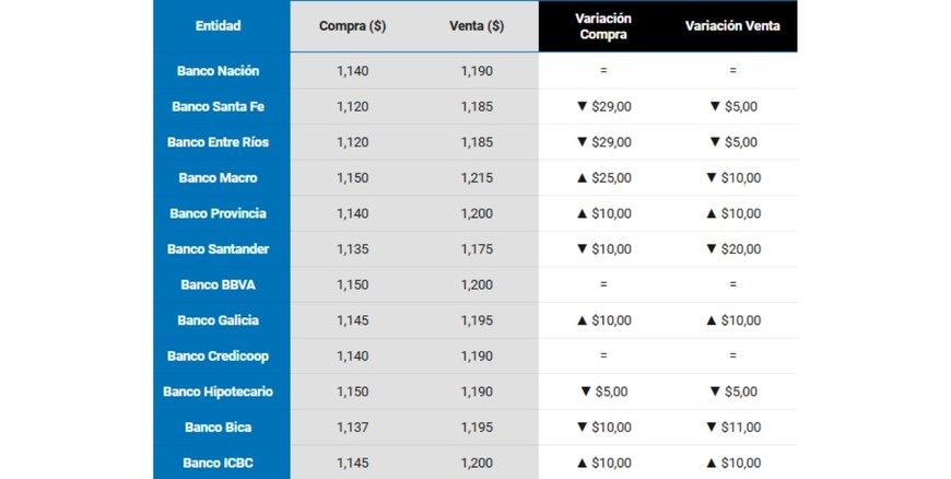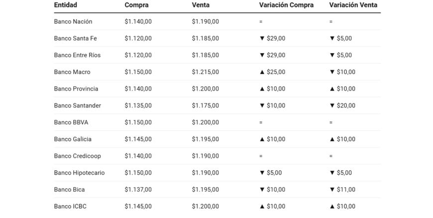 En el Banco Nación, el tipo de cambio se mantuvo estable en $1.190 para la venta. El dólar blue retrocedió hasta los $1.205, ampliando levemente la brecha con el oficial.