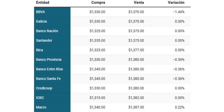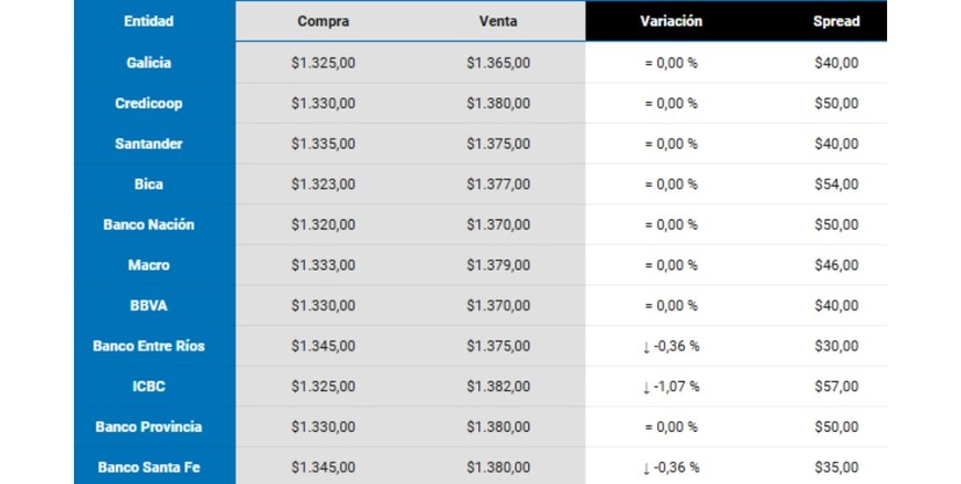Martes 05.0809:31 La cotización de cada banco al cierre del lunes