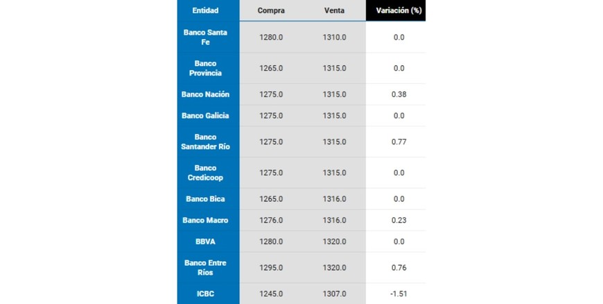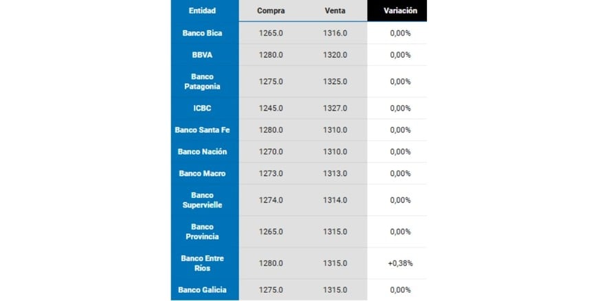 El dólar “blue” se ofrecerá a $ 1.315 y $ 1.335 para ambas puntas. En tanto, el MEP lo hará en $ 1.297 y el Contado con Liquidación en $ 1.305.