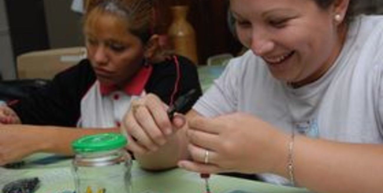 Fiorella es otra de las docentes, que les muestra cómo trabajar con diversos materiales: piedras, canutillos, telas, papel y cintas. “La idea es poder reciclar lo que tienen en la casa porque a veces los materiales son muy costosos. Esa es una forma de recuperar algo que no usan para darle otro destino: venderlo, regalárselo a alguien o que lo usen ellas mismas”, explicó la joven.