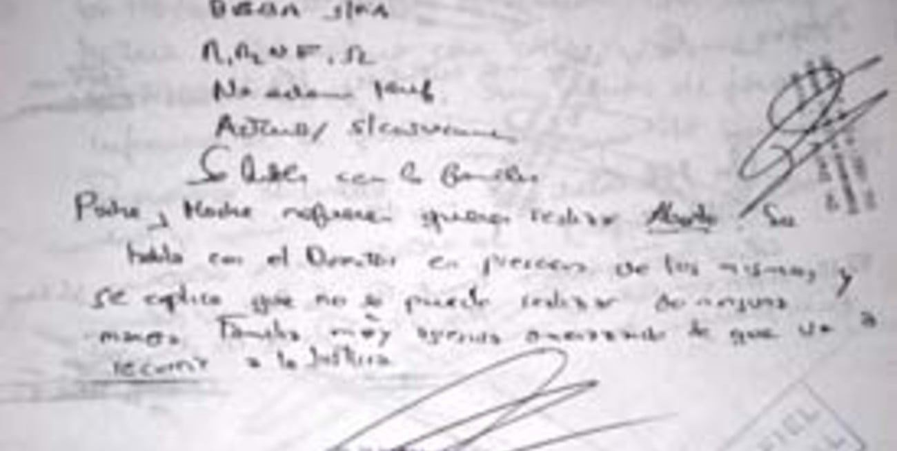 En este punto, transcribe textualmente la historia clínica: ``Se habla con los familiares. Padre y madre refieren querer realizar aborto. Se habla con el director en presencia de los mismos y se explica que no se puede realizar de ninguna manera. Familia muy agresiva amenazando que va a recurrir a la Justicia''.