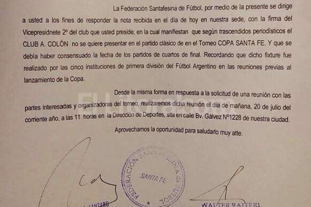 “La Federación Santafesina de Fútbol, por medio de la presente se dirige a usted a los fines de responder la nota recibida en el día de hoy en nuestra sede, con la firma del Vicepresidente 2º del club que usted preside, en el cual manifiestan que según trascendidos periodísticos el Club A. Colón no se quiere presentar en el partido clásico en el Torneo Copa Santa Fe. Y que se debía haber consensuado la fecha de los partidos de cuartos de final. Recordando que dicho fixture fue realizado por las cinco instituciones de primera división del Fútbol Argentino en las reuniones previas al lanzamiento de la Copa: