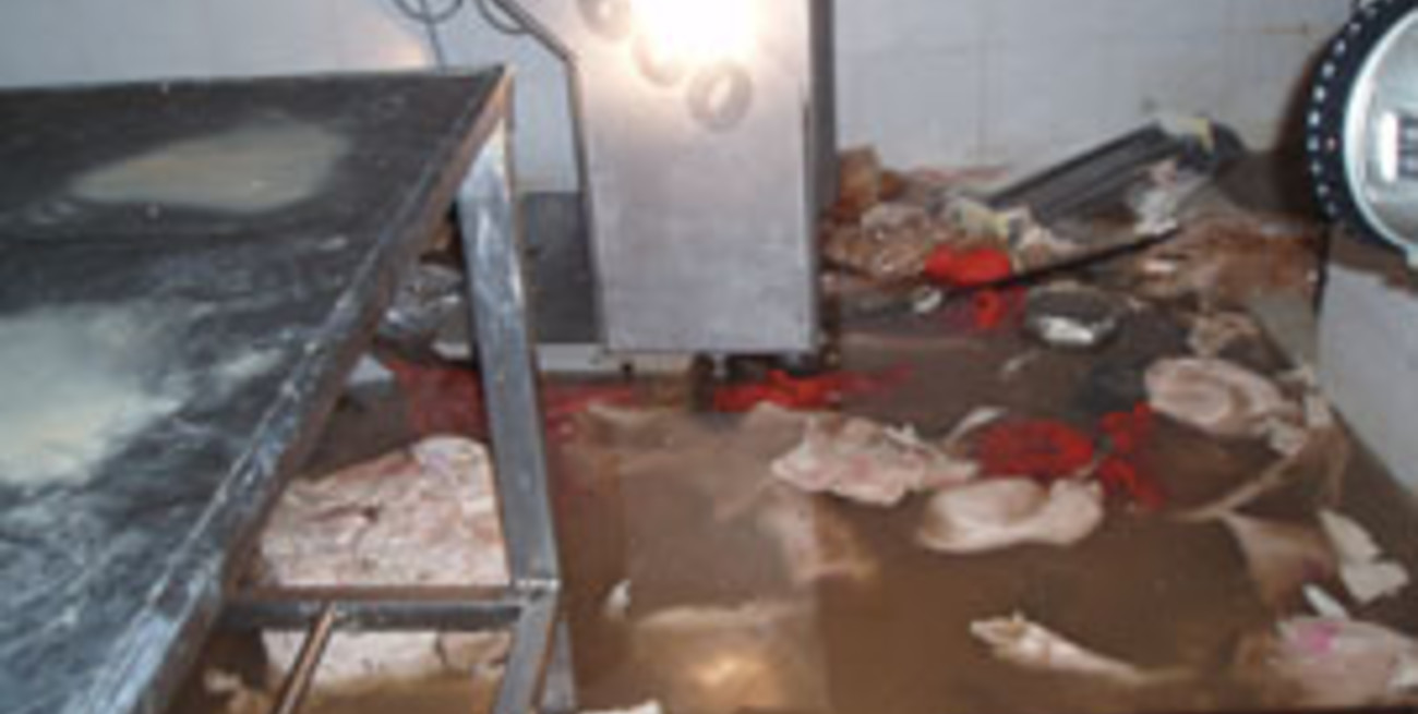El panorama era desolador cuando los vándalos abandonaron la fábrica. Había trozos de carne esparcidos por el suelo y flotando en el agua de lluvia, papeles desparramados en la administración y hasta una pileta del baño fue destrozada.