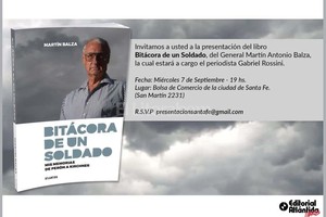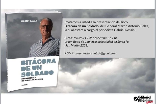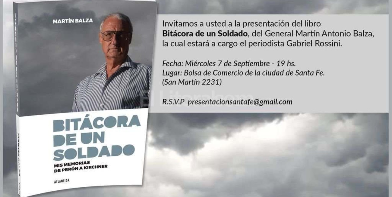 El general Martín Antonio Balza presentará el miércoles 7 de setiembre su libro "Bitácora de un Soldado. Mis memorias de Perón a Kirchner" en el auditorio de la Bolsa de Comercio de Santa Fe con entrada libre y gratuita.